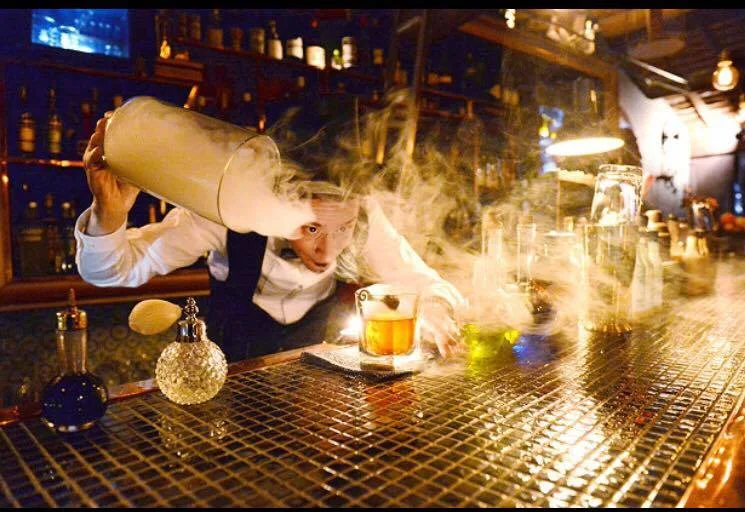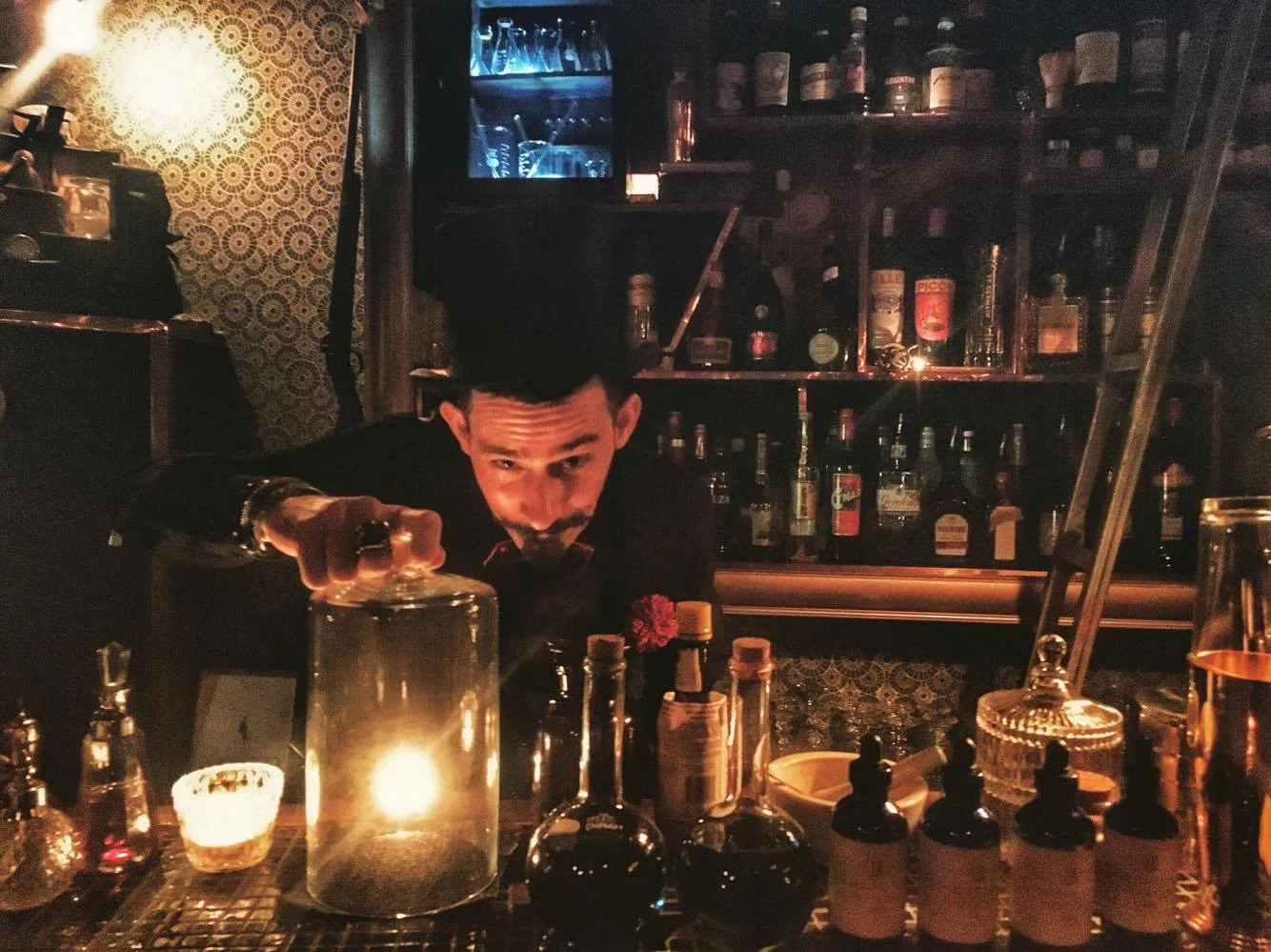 A surreal cocktail bar near the Kamo River known for its steampunk design, magic-inspired drinks, and theatrical charm.
