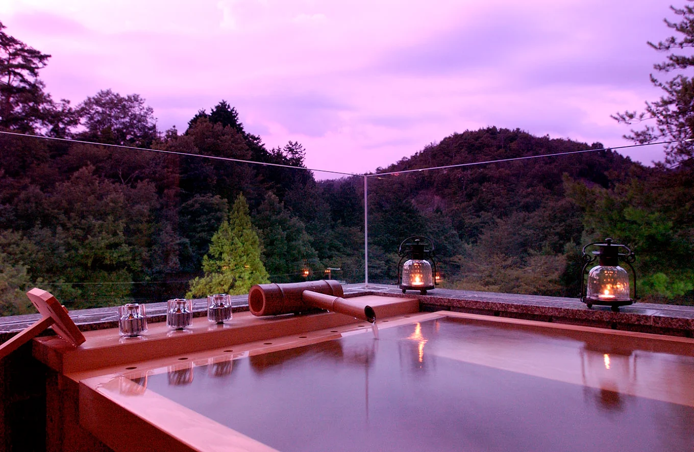 Ryokan Sumiya Kihoan is a traditional onsen ryokan set in the forested hills north of Kyoto, offering a quiet retreat about 20 minutes by train from the city center. Guest rooms range from standard tatami layouts to accommodations with private open-air baths facing the surrounding woodland. A distinctive feature of the property is its secluded forest onsen, reached by a short path, where bathing is framed by trees and seasonal sounds rather than by architecture. Kaiseki meals feature seasonal ingredients, reinforcing the ryokan’s emphasis on pacing, nature, and separation from urban rhythms rather than sightseeing convenience.
