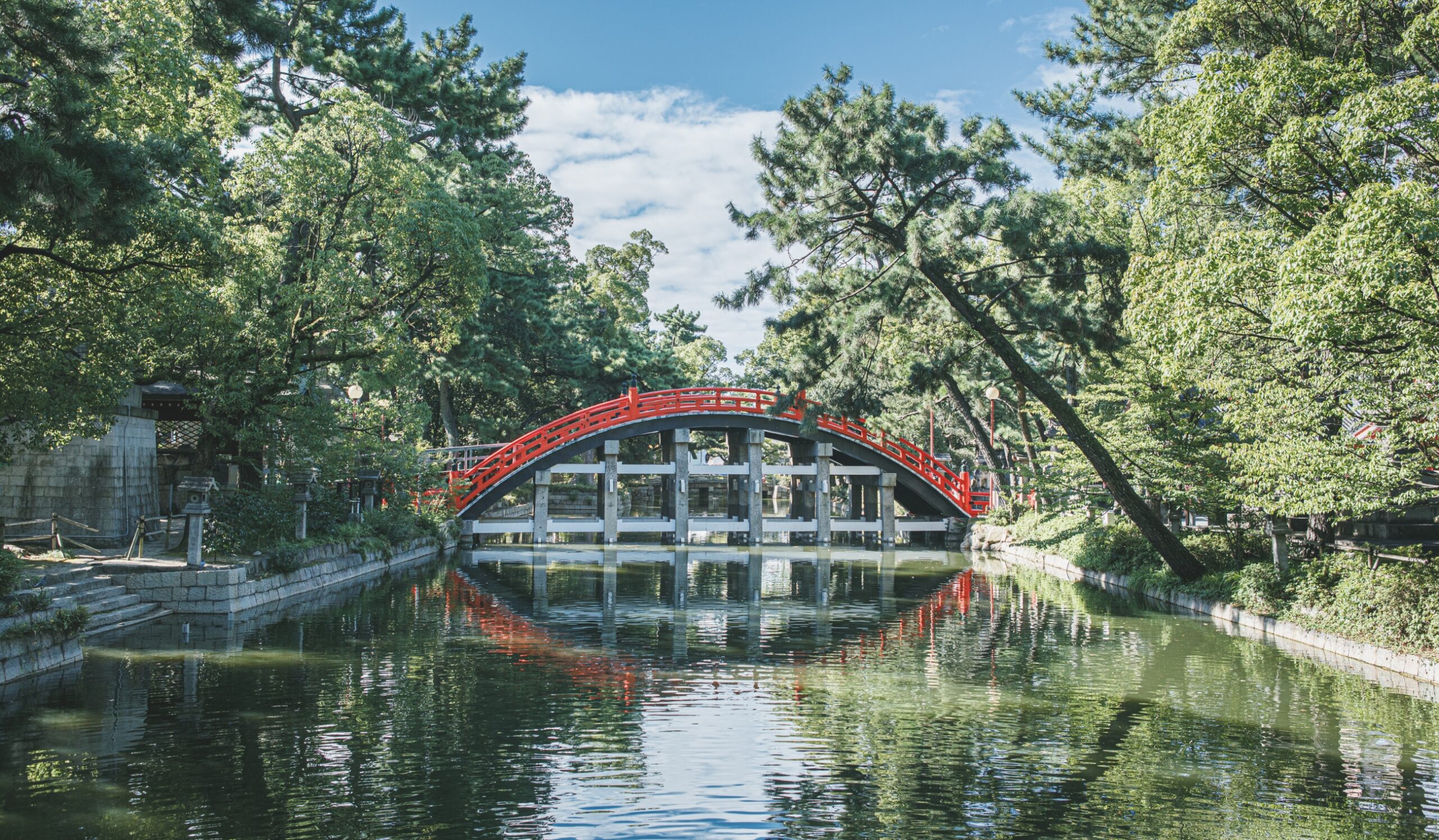 The grounds are flat and easy to walk on, and the architecture follows the Sumiyoshi zukuri style, an ancient Shinto form, with the main hall as its most prominent example. The Taikobashi Bridge is also quite iconic.